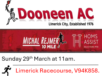 The Michal Rejmer memorial 10-mile road race hosted by Dooneen A.C. on Sunday March 29th starting at Limerick Racecourse, Greenmount Park, Patrickswell,Co. Limerick. Postcode V94 K858.