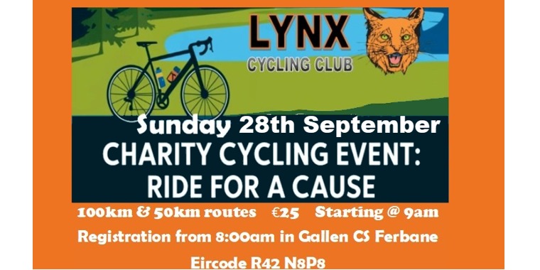 Start Time: 09:00 from Gallen Community School Ferbane Lynx Cycling Club are delighted to welcome the return of their Charity Cycle on 28th September 2025. There will be 2 routes to choose from, 100km and 50km options.