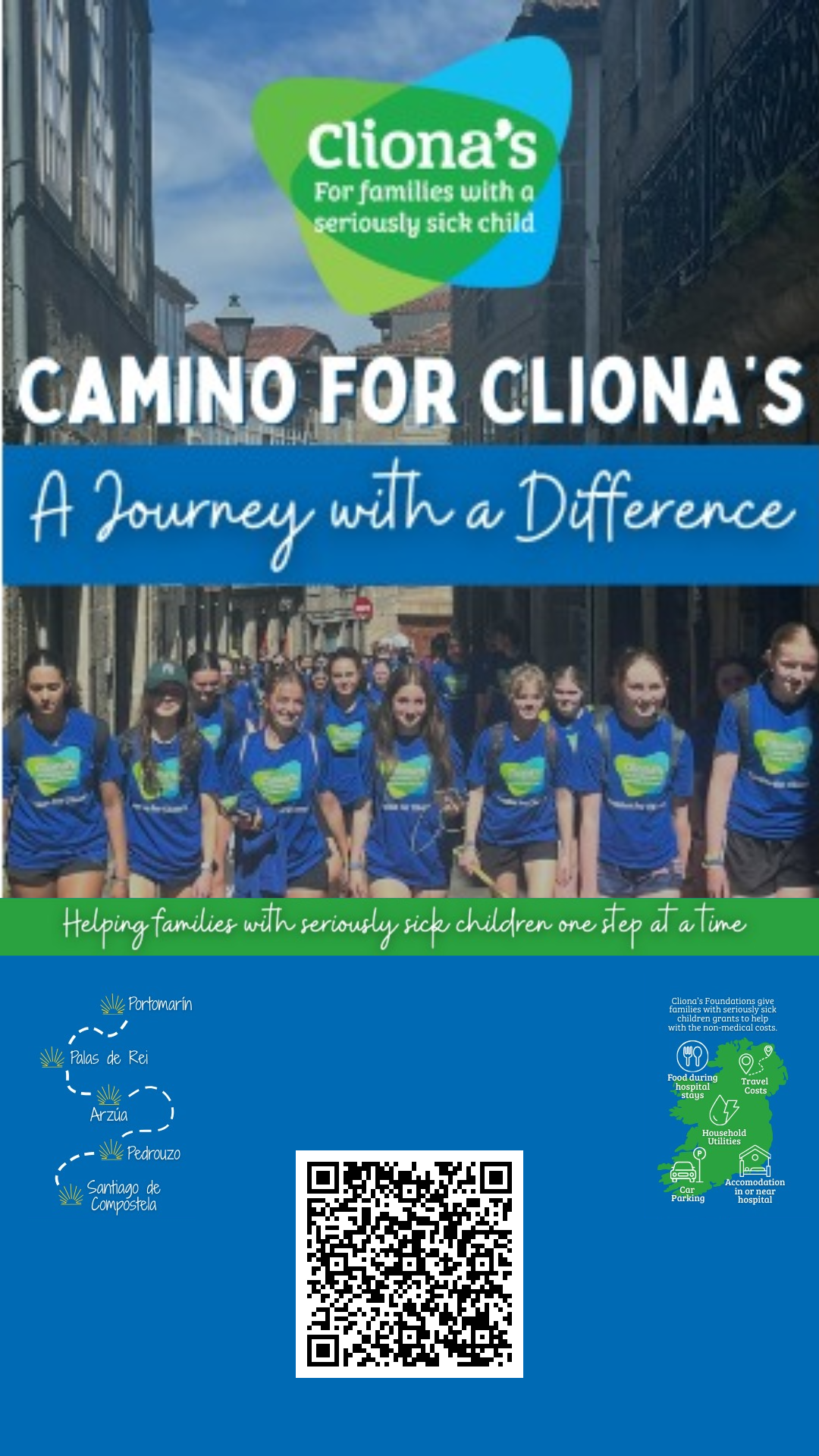 Thanks so much for visiting my fundraising page for Cliona’s Foundation — your support means a lot. In April and June 2026, over 200 students and teachers from across Ireland will walk 100km of the Camino de Santiago, from Portomarin to Santiago, over 4 days. We’re walking in solidarity with families facing the emotional and financial challenges of caring for a seriously ill child. Each student is raising at least €1,000 — with 100% of funds going directly to Cliona’s Foundation. Travel costs are covered by us. It’s an incredible experience and a privilege to support such a meaningful cause. If you can, please share this page — your support makes a real difference. Thank you!