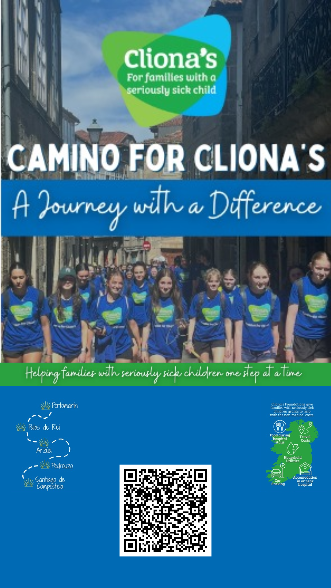 Thanks so much for visiting my fundraising page for Cliona’s Foundation — your support means a lot. In April and June 2026, over 200 students and teachers from across Ireland will walk 100km of the Camino de Santiago, from Portomarin to Santiago, over 4 days. We’re walking in solidarity with families facing the emotional and financial challenges of caring for a seriously ill child. Each student is raising at least €1,000 — with 100% of funds going directly to Cliona’s Foundation. Travel costs are covered by us. It’s an incredible experience and a privilege to support such a meaningful cause. If you can, please share this page — your support makes a real difference. Thank you!