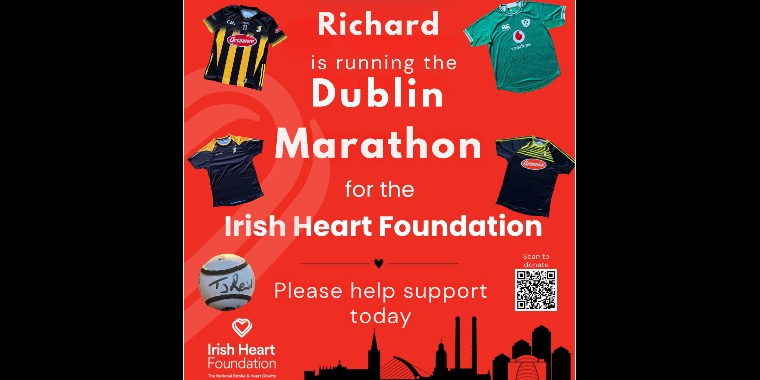 Donate, Support, Win Dear Friends, I'm thrilled to announce that I'll be running the Dublin City Marathon again, all in support of the Irish Heart Foundation. Last year, thanks to your incredible generosity, I was able to raise over €3,000. With your help, I'm aiming to surpass that goal and make an even bigger impact. The Irish Heart Foundation is a leading charity dedicated to improving heart health and fund vital research, provide education and support. Your donation will directly contribute to their lifesaving work. As a special thank-you, there are prises up for grabs. Donate and leave your name to Enter a draw to win a TJ Reid signed Kilkenny Jersey, a Jack Crowley signed Rugby Jersey, 1 of 2 signed TJ Reid Training Jersey or a sliotar signed by TJ Reid, Joe Canning and Jackie Tyrell. Every euro counts and together, we can make a difference and help build a healthier future for everyone. Thank you for your support! RC